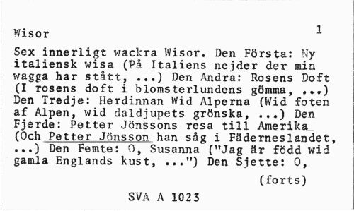 //// Wisor 1 //// Sex innerligt wackra Wisor. Den Första: Ny italiensk wisa (På Italiens nejder der min wagga har stått, ...) Den Andra: Rosens Doft (I rosens doft i blomsterlundens gömma, Den Tredje: Herdinnan Wid Alperna (Wid foten af Alpen, wid daldjupets grönska, ...) Den Fjerde: Petter Jönssons resa till Amerika (Och Petter Jönsson han såg i Fäderneslandet, ...) Den Femte: 0, Susanna ("Jag är född wid gamla Englands kust, ...") Den Sjette: 0, //// (forts) //// SVA A 102 3 ////