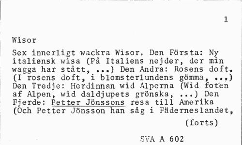 //// 1 //// Wisor //// Sex innerligt wackra Wisor. Den Första: Ny italiensk wisa (På Italiens nejder, der min wagga har stått, ...) Den Andra: Rosens doft. (I rosens doft, i blomsterlundens gömma, ..,) Den Tredje: Herdinnan wid Alperna (Wid foten af Alpen, wid daldjupets grönska, ...) Den Fjerde: Petter Jönssons resa till Amerika (Och Petter Jönsson han såg i Fäderneslandet, //// (forts) //// SVA A 602 ////