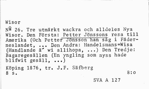 //// Wisor //// N- 26. Tre utmärkt wackra och alldeles Nya Wisor. Den Första: Petter Jönssons resa till Amerika (Och Petter Jönsson han såg i Fäderneslandet, ... Den Andra: Handelsmans=Wisa (Handlande ä"* wi allihopa, ...) Den Tredje: Bagaregesällen (En yngling som nyss hade blifwit gesäll, ...) //// Köping 1876, tr. J.F. Säfberg 8 s. 8:o //// SVA A 12 7 ////