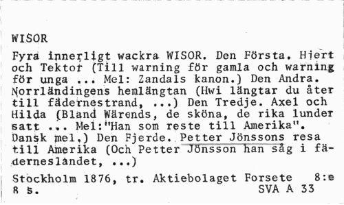 //// WISOR //// Fyra innerligt wackra WISOR. Den Första. Hiert och Tektot (Till warning för gamla och warning för unga ... Mel: Zandals kanon.) Den Andra, i^orrländingens hemlängtan (Hwi längtar du åter till fädernestrand, ...) Den Tredje. Axel och Hilda (Bland Wärends, de sköna, de rika lundeT satt ... Mel:"Han som reste till Amerika". Dansk mel.) Den Fjerde. Petter Jönssons resa till Amerika (Och Petter Jönsson härTslg i fäderneslandet, ...) //// Stockholm 1876, tr. Aktiebolaget Forsete 8:e 8 5. SVA A 33 ////