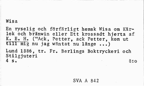 //// Wisa //// En ryselig och förfärligt hemsk Wisa om Kärlek och bränwin eller Ett krossadt hjerta af K. E. H. ("Ack, Petter, ack Petter, kom ut till mig nu jag wäntat nu länge ...) //// Lund 1886, tr. Fr. Berlings Boktryckeri och Stilgjuteri //// 4 s. 8:0 //// SVA A 842 ////