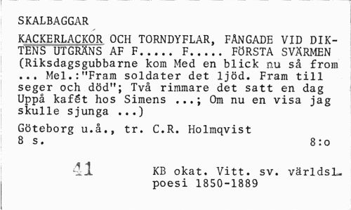 //// SKALBAGGAR //// KACKERLACKOR OCH TORNDYFLAR, FÅNGADE VID DIKTENS UT GRÄNS AF F... F... FÖRSTA SVÄRMEN //// (Riksdagsgubbarne kom Med en blick nu så from ... Mel.:"Fram soldater det ljöd. Fram till seger och död"; Två rimmare det satt en dag Uppå kafét hos Simens ...; Om nu en visa jag skulle sjunga ...) //// Göteborg u.å., tr. C.R. Holmqvist 8 s. 8:0 //// 11 KB okat. Vitt. sv. världsL. //// poesi 1850-1889 ////
