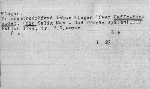 //// K lagan . //// En Högsthedrefwad Rnkas Klagan ^fwer C af fe -JPör-bM^t. (Min Salig Man - Gud frögde själ enl..."f Fa hl un 1799, tr. P.O.Ascmar . //// 8 s. 8:© //// I 23 ////