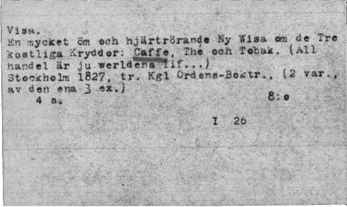 //// Vi »a. //// ifin rjycJcet öm och hjärtrörande Ny Wisa om de Tre kostliga Kryddor: Caffo. Thé och Tebak. (All handel är ju werldeW^if. . .) //// Stooicholm 1827, tr. Kgl Ord ens-Bok tr.. (2 var., av den ena 3 ) //// 4 Si 8: e //// " I 26 f! ////