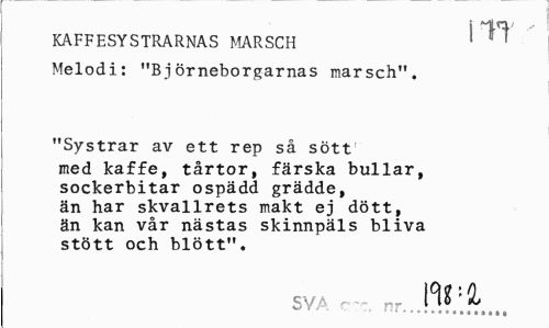 //// KAFFESYSTRARNAS MARSCH ' ^ //// Melodi: "Björneborgarnas marsch". //// "Systrar av ett rep så sött med kaffe, tårtor, färska bullar, sockerbitar ospädd grädde, än har skvallrets makt ej dött, än kan vår nästas skinnpäls bliva stött och blött". //// SVA c rr.J^.j!1,,, ////