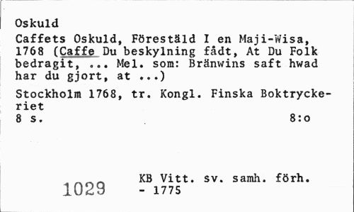 //// Oskuld //// Caffets Oskuld, Förestäld I en Maji-Wisa, 1768 (Caffe Du beskylning fådt, At Du Folk bedragit, „.. Mel. som: Bränwins saft hwad har du gjort, at ...) //// Stockholm 1768, tr. Kongl. Finska Boktryckeriet //// 8 s. 8:o //// KB Vitt. sv. samh. förh. 1029 - 1775 ////