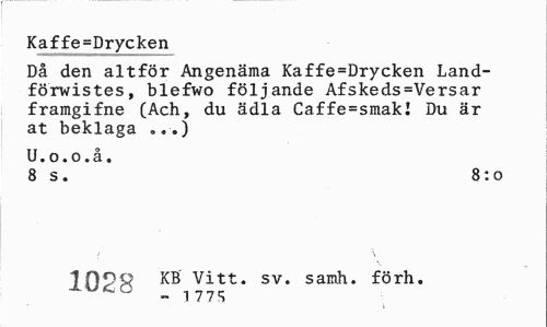 //// Kaffe=Drycken //// Då den altför Angenäma Kaffe=Drycken Land-förwistes, blefwo följande Afskeds=Versar framgifne (Ach, du ädla Caffe=smak! Du är at beklaga ..-.) //// U.o.o.å. //// 8 s. 8:0 //// 1f)95< KB" Vitt. sv. samh. förh. ////