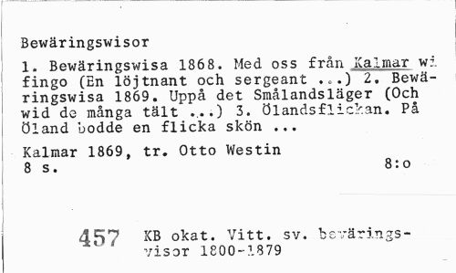 //// I //// Bewänngswisor //// 1. Bewäringswisa 1868. Med oss från Kalmar wi fingo (En löjtnant och sergeant ...) 2. Bewäringswisa 1869. Uppå det Smålandsläger (Och wid de många tält ...) 3. Öl ands flickan. På Öland bodde en flicka skön ... //// Kalmar 1869, tr. Otto Westin 8 s. 8:o //// 457 XB okat. Vitt. sv. bevärings-visor 1800-1879 ////