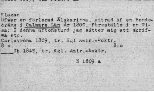 //// Klagan //// Ofwer en förlorad Älskarinna, yttrad Af en Bordedräng i Cal^are Lan År 1805, föreställs i en aa; I denna aftonstund jiac- sätter mig att skrif-wa etc. //// Carlskrona 1309, tr. Kgl Amir.-^oktr. 8 s. 8;o __Ito 1845, tr. Kgl. Amir.-Boktr. //// K 1809 a ////