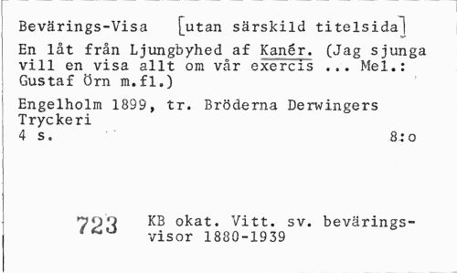//// Bevärings-Visa [utan särskild titelsi da] //// En låt från Ljungbyhed af Kanér. (Jag sjunga vill en visa allt om vår exercis .,. Mel.: Gustaf örn m.fl.) //// Engelholm 1899, tr. Bröderna Derwingers Tryckeri //// 4 s. 8; o //// 7p'i KB okat. Vitt. sv. bevärings-visor 1880-1939 ////