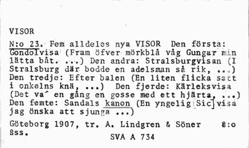 //// VISOR //// N:o 23. Fem alldeles nya VISOR Den första: Gondolvisa (Fram öfver mörkblå våg Gungar min lätta båt. ...) Den andra: Stralshurgvisan (I Stralsburg där bodde en adelsman så rik, , ,„) Den tredje: Efter balen (En liten flicka satt i onkelns knä, .,.) Den fjerde: Kärleksvisa (Det va' en gång en gosse med ett hjärta, «»•) Den femte: Sandals kanon (En yngelig ! Sic] visa jag önska att sjunga ...) //// Göteborg 1907, tr. A. Lindgren & Söner %:o 8SS# SVA A 734 ////