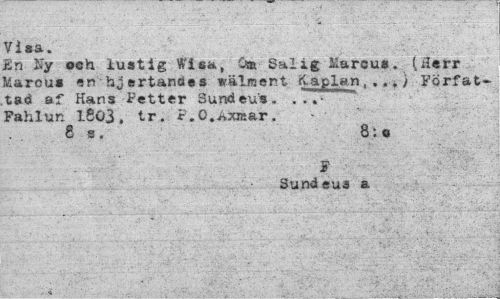 //// Visa. //// Än Ny och lustig Wisa, Oaa Salig Marsus. (flerr Marcus en hjertandss wälment Kaplan..) Förfat-tad af Hans Petter Sundeus. . .. Fahlun lS03. tr. P.O.Åxrear. //// 8 s. 8:0 //// i //// Sundeus a ////