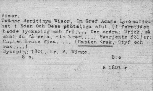 //// Visor. //// Twdnne Sprittnya Wisor, Om Gr«f Adamshyoksalikhet 1 Sdcn Oeh Dess plötsliga atut. ( I femtid eh //// t ©dd# ¦ lyeksalig och fri,... Den Andra; Prick, sa skal. du få tre ta, min "bror...) Hwar.femte följer;; Capterv^raka Vfisa. ... (Capten Kräk, Styf och //// rak , . . . } iriv~r« .oj //// Nyköping 1301, tr. P. Wi.nge . //// 8s. 8.e //// E 1801 r ////
