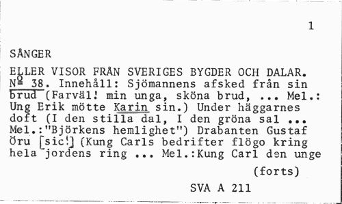 //// 1 //// SÅNGER //// ELLER VISOR FRÄN SVERIGES BYGDER OCH DALAR. N- 38. Innehåll: Sjömannens afsked från sin brud (Farväl.' min unga, sköna brud, ... Mel.: Ung Erik mötte Karin sin.) Under häggarnes doft (I den stilla dal, I den gröna sal ... Mel.:"Björkens hemlighet") Drabanten Gustaf öru [sicij (Kung Carls bedrifter flögo kring hela jordens ring ... Mel.:Kung Carl den unge //// (forts) //// SVA A 211 ////