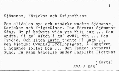 //// 1 //// Sjömans=, Kärleks= och Krigs=Wisor //// Fem alldeles nya och utmärkt v/ackra Sjömans=, Kärleks= och Krigs=Wisor. Den Första: Sjömans-Sång. Ut på hafwets vida yta Will jag ... Den Andra. Si gu^ afton å gu' qwäll Min ... Den Tredje. Och liten Karin tjente På unga ... Den Fjerde: Qwäntad bröllopsgäst. Ä Jungfrun i högande löftet Hon ... Den Femte: Korporal Sund. En sann händelse under Engelska Flottans //// ( forts) //// SVA å 56 8 ////