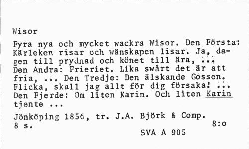 //// Wisor //// Fyra nya och mycket wackra Wisor. Den Första: Kärleken risar och wänskapen lisar. Ja, dagen till prydnad och könet till ära, . Den Andra: Frieriet. Lika swårt det är att fria, ... Den Tredje: Den älskande Gossen. Flicka, skall jag allt för dig försaka.' Den Fjerde: Om liten Karin. Och liten Karin ti ente ... //// Jönköping 1856, tr. J.A. Björk & Comp. 8 s. 8:0 //// SVA A 905 ////