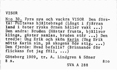 //// VISOR //// N:o 30. Fyra nya och vackra VISOR Den första: Pultavas hjältebragd (Långt i fjärran land i öster ryska örnen håller vakt ...) Den andra: Bruden (Hästar frusta, bjällror klinga, gäster samlas, bruden står ...) Den tredje: Ung Erik och skön Karin (Ung Erik mötte Karin sin, på skogens Öde stig. ...) Den fjerde: Hvad befalls? (Brinnande för flickans fot jag föll, ...) //// Göteborg 1909, tr. A. Lindgren & Söner 8 s. 8 :o //// SVA A 288 ////