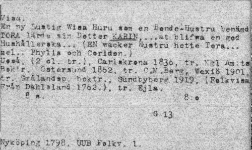 //// Er- ny Lust!* Wisa Huru ssm en Bsnde-Hustru bena-na rOPJ. IAt** str, DstterJ^aiy, . . .at blifwa en Hushållerska, .. (EK vacker Huatrfc hette Tora... pel'.; Phylis Csrlisn.) //// Utså (2 cl. tr.). Cat*iskrsna l?3ö, tr. Anuta fe »k t r , Östersund 1862, tr. C^.Berf?, Wexiö 1901, kr. tålands-o, bolctr., Sundbyberg 1919, ("FsUvisfi Dahl s land 1762.), tr. "Ejla. //// j - 8 s. V 8; s 1 //// j G 13 //// i... v^ \ //// i *?ap> t irra ffaivtr i . ////