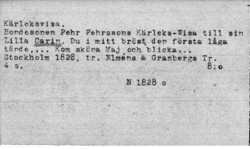 //// Kärlc&avi sm. //// Eonriesonen Pehr Pehrsaons Kärleka-Wisa till sin Lilla ^arln. Du i mitt bröst den första låga tände,... *Tom skena Yaj ^ och blicka... Stockholm 1828, tr. Elména ic Granbergs Tr. 4 s. 8; o //// N 1828 o ////