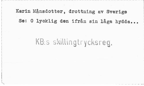 //// Karin Månsdotter, drottning av Sverige Se: 0 lycklig den ifrån sin låga hydda... //// ; KB.s skillingtrycksreg, ////