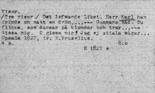 //// Viaor. //// /Tre rieor./ 13«t lefwande Liket. Herr Karl han cJrcadé om natt en dröm,. „- Gumma ra ~Rac. T>u flicka, aom daraar pk tlcmmcr cch tror...---ölaea mig. C gisaa mig? Jag ej uttala -»rågar... Upaala 1.327, tr. K.Bruaelius. -4 a. 8; o //// E 1827 a ////