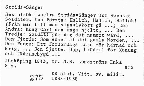//// Strids=Sånger //// Sex utsökt wackra Strids=Sånger för Swenska Soldater. Den Första: Halloh, Halloh, Halloh! (Från man till man signalskott gå ...) Den Andra: Kung Carl den unga hjelte, ... Den Tredje: Soldat! gör dig det namnet wärd, ... Den- Fjerde: Som söner af det gamla Norden, ... Den Femte: Ett fordomdags säte för härnad och krig, ... Den Sjette: Upp, bröder! för Konung och fädernebygd ... //// Jönköping 1843, tr. N.E. Lundströms Enka 8 s. 8:0 //// 07P KB okat. Vitt. sv. milit. //// 6' 1835-1938 ////