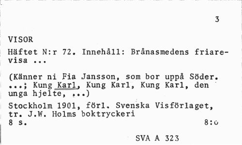 //// 3 //// VISOR //// Häftet N:r 72. Innehåll: Brånasmedens friare-visa ... //// (Känner ni Fia Jansson, som bor uppå Söder. ...; Kung Karl, Kung Karl, Kung Karl, den unga hjelte, ...) //// Stockholm 1901, förl. Svenska Visförlaget, tr. J.W. Holms boktryckeri 8 s. 8:o //// SVA A 32 3 ////