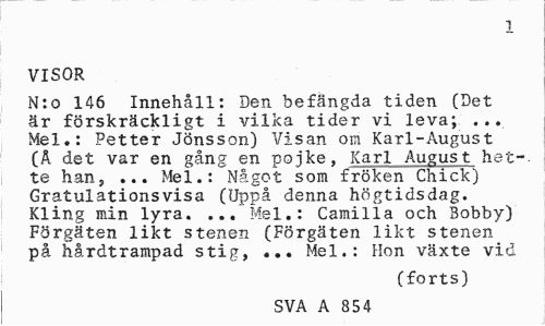 //// 1 //// VISOR //// N:o 146 Innehåll: Den befängda tiden (Det är förskräckligt i vilka tider vi leva; ... Mel.: Petter Jönsson) Visan om Karl-August (Å det var en gång en pojke, Karl August het-te han, ... Mel.: Något som fröken Chick) Gratulationsvisa (Uppå denna högtidsdag. Kling min lyra. ...Mel.: Camilla och Bobby) Förgäten likt stenen (Förgäten likt stenen på hårdtrampad stig, ... Mel.: Hon växte vid //// (forts) //// SVA A 2 854 ////