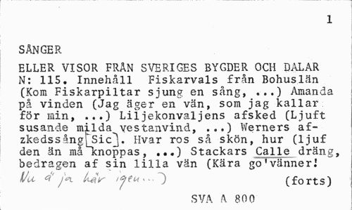 //// 1 //// SÅNGER //// ELLER VISOR FRÅN SVERIGES BYGDER OCH DALAR N: 115. Innehåll Fiskarvals från Bohuslän (Kom Fiskarpiltar sjung en sång, ...) Amanda på vinden (Jag äger en vän, som jag kallar för min, ...) Liljekonvaljens afsked (Ljuft susande milda vestanvind, ...) Werners af-zkedssångTsicf}. Hvar ros så skön, hur (ljuf den än må knoppas, ...) Stackars Calle dräng, bedragen af sin lilla vän (Kära go1vänner! //// I/u Latr /jeut* (forts) //// SVA A 800 ////