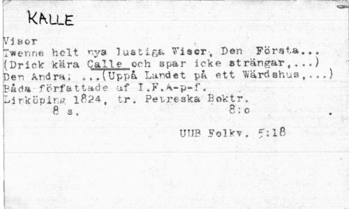 //// KhLLE //// Visor //// Tweririii helt nya lus tigs» ^"iacr, Den Förata... (Drick- kära Calle och spar icke strängar,...) Den Andrn. ...(Uppå Landet på ett Wärd ahus , , ..) Båda författade af I.F.A-p-f. Ljrköpira 1&2A, tr. Pei-reska Boktr. //// 8 s. 8:0 //// UT IB Folkv. 5; 18 ////