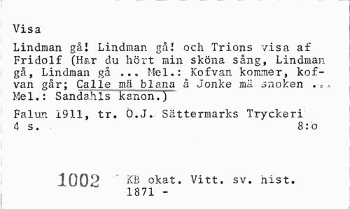 //// Visa //// Lindman gål Lindman gå,' och Trions visa af Fridolf (Har du hört min sköna sång, Lindman gå, Lindman gå ... Mel.: Kofvan kommer, kof-van går; Calle mä bl ana å Jonke mä snoken . •„ .„ Mel.: Sandahls kanon.) //// Falun 1911, tr. Ö.J. Sättermarks Tryckeri 4 s. 8:ö //// 3 002 '' KB okat« vitt. sv. hist. 1871 - ////