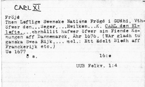//// Fröj4 //// Then Loflige Swenske Nations Frögd i GUdhi, Vth öfwer den...Seger„...Hwilken.,.K. CaHL den El» 1 efte...,ehrhållit hafwer öfwer sin Fiende Konungen aff Dannemarck, Ähr 1676» (WAr gladh tu ganska Swea Rijk,... mel.; Ett ädelt Biedh aff Franckerijk etc.) Uo 1677 //// 8 8. 16:e //// UUB Folkv. 1:4 ////
