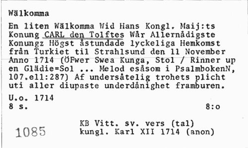 //// Wälkomma //// En liten Wälkomma Wid Hans Kongl. Maij:ts Konung CARL den Tolftes Wår Allernådigste Konungz Högst åstundade lyckeliga Hemkomst från Turkiet til Strahlsund den 11 November Anno 1714 (ÖFwer Swea Kunga, Stol / Rinner up en Glädie=Sol ... Melod esåsom i PsalmbokenN, 107.ell:287) Af undersåtelig trohets plicht uti aller diupaste underdånighet framburen. //// U.o. 1714 //// 8 s. 8:o //// KB Vitt. sv. vers (tal) 1085 kungl. Karl XII 1714 (anon) ////