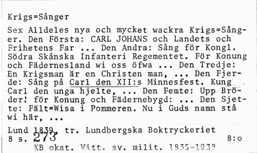 //// Krigs=Sånger //// Sex Alldeles nya och mycket wackra Krigs=Sång-er. Den Första: CARL JOHANS och Landets och Frihetens Far ... Den Andra: Sång för Kongl. Södra Skånska Infanteri Regementet. För Konung och Fädernesland wi oss öfwa ... Den Tredje: En Krigsman är en Christen man, ... Den Fjerde: Sång på Carl den XII:s Minnesfest. Kung Carl den unga hjelte, ... Den Femte: Upp Bröder! för Konung och Fädernebygd: ... Den Sjet-te: Fält=Wisa i Pommeren. Nu i Guds namn stå wi här, ... //// Lund 1&59-™ tr. Lundbergska Boktryckeriet 8 s . 2 7 o 8: o //// KB okat. Vitt. sv. milit. 1835-193? ////