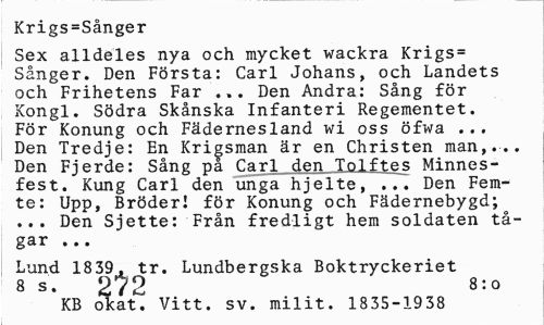 //// Krigs=Sånger //// Sex alldeles nya och mycket wackra Krigs= Sånger. Den Första: Carl Johans, och Landets och Frihetens Far ... Den Andra: Sång för Kongl. Södra Skånska Infanteri Regementet. För Konung och Fädernesland wi oss öfwa ... Den Tredje: En Krigsman är en Christen man,... Den Fjerde: Sång på Carl den Tolftes Minnesfest. Kung Carl den unga hjelte, ... Den Femte: Upp, Bröder! för Konung och Fädernebygd; ... Den Sjette: Från fredligt hem soldaten tågar ... //// Lund 1839. tr. Lundbergska Boktryckeriet 8 s. 272 8: o //// KB okat. Vitt. sv. milit. 1835-1938 ////