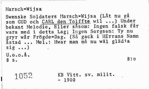 //// Marsch=Wijsa //// Swenske Soldaters Marsch=Wijsa (LÅt nu gå som GUD och CARL den Tolffte wil ...) Under bekant Melodie, Eller såsom: Ingen falsk får wara med i detta Lag; Ingen Sorgsen: Ty nu //// fryr wår Frögde=Dag. (Så*gäck i HErrans Namn stad ... Mel.: Hwar man må nu wäl glädia sig ...) //// U.o.o.å. //// 8 s. 8"o //// i 1 052 KB Vitt. sv. milit. //// I - 1900 ////