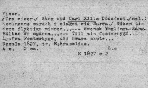 //// Visor. //// /Tre visor./ Sång *i«i Carl XXI: s Dödsfest ./mel,: Konungens marsch i sla'giT~wiT'*!4S'arwa./ 'Ä'iken tidens flyktiga minnen...»-» Swensk Yftglinga*3ån;r» Balter. Hi spänna...--- Till min fosterbygd. -Ljufwa Fosterbygd, uti hvars sköte... Kpsala 182?, tr. K.Bruzelius. 4 s. 2 ex. B: o //// £ 1Ö27 c 2 ////