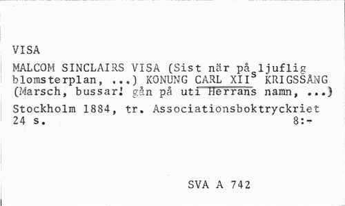 //// VISA //// MALCOM SINCLAIRS VISA (Sist när på ljuflig blomsterplan, ,..) KONUNG CARL XII KRIGSSÄNG (Marsch, bussar! gån på uti Herrans namn, ...} //// Stockholm 1884, tr. Associationsboktryckriet 24 s. 8:- //// SVA A 742 ////