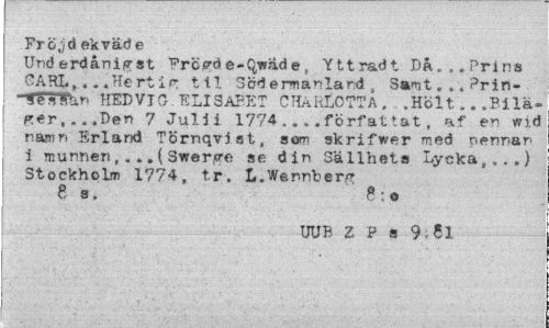 //// Frö,)d ek vad e //// Und erdånigst ^rcsröe«Q,wäde, Yttradt Da. Prins CARL,.. .Hertig til Södermanland, Samt...?rin« -SSTSkn HEDVIG.ELISABET CHARLOTTA» .Holt...Bilager, ...Ben 7 Julii 1774 ... förfat tat, af en wid namn Erland Törnqvjst, som skrifwer med pennan i munnen,...(Swerge se din Sällhets Lycka,...) Stockholm 1774, tr. L.Wennberg //// 8 s. 8:© //// UUB Z P s 9,8l ////