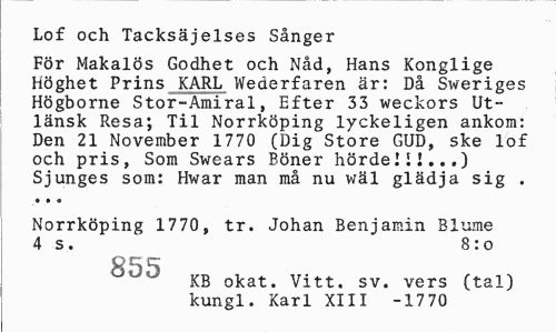 //// Lof och Tacksäjelses Sånger //// För Makalös Godhet och Nåd, Hans Konglige Höghet Prins KARL Wederfaren är: Då Sweriges Högborne Stor-Amiral, Efter 33 weckors Ut-länsk Resa; Til Norrköping lyckeligen ankom: Den 21 November 1770 (Dig Store GUD, ske lof och pris, Som Swears Böner hörde II!...) //// Sjunges som: Hwar man må nu wäl glädja sig . • • « //// Norrköping 1770, tr. Johan Benjamin Blume 4 s. 8:o //// UU KB okat. Vitt. sv. vers (tal) kungl. Karl XIII -17 70 ////
