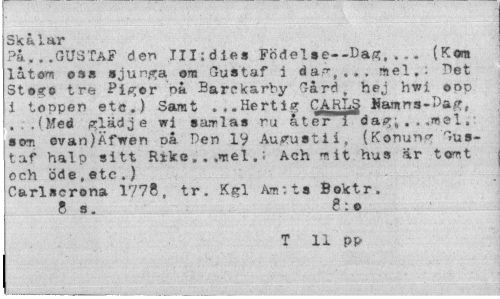 //// Skålar //// GUSTAF den JII:dies Födelse--Dag,... (Kom låtom oss sjunga om Gustaf i da--%... mel.: "Det Stos;© tre Piger på Barekarby Gård, hej hwi oop i toppen etc.) Samt ...Hertig CARLS Namns-Pag, ...(Med glädje wi sa-rlas ru åter i dag; . , ,mel»¦ son ovan)Kfwen oå Pen iy Ausrustii, (Konung'Gustaf halp sitt Rike.. .mel.; Ach mit hus är tomt och öde,etc.) //// Carlscrona 1778, tr. Kgl Am;ts Boktr. //// 8 s. 8 : © //// T II pp ////