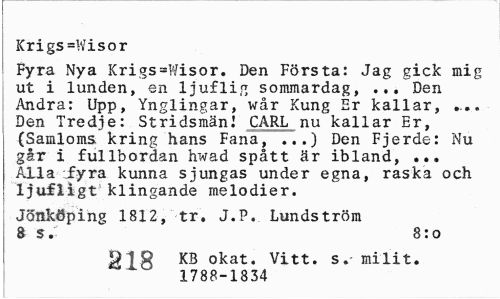 //// Krigs=Wisor //// Fyra Nya Krigs=Wisor. Den Första: Jag gick mig ut i lunden, en ljuflig sommardag, ... Den Andra: Upp, Ynglingar, wår Kung Er kallar, ... Den Tredje: Stridsmän! CARL nu kallar Er, (Samloms kring hans Fana, ...) Den Fjerde: Nu går i fullbordan hwad spått är ibland, ... Alla fyra kunna sjungas under egna, raska och ljufligt klingande melodier. //// Jönköping 1812, tr. J.P. Lundström 8 s. 8:0 //// 91g KB okat. Vitt. s.- milit. //// ' 1788-1834 ////