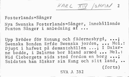 //// Kmc xfy /tfitnh/ 2 //// Fosterlands=Sånger //// Nya Swenska Fosterlands=Sånger, Innehållande Femton Sånger i anledning af ... //// Upp Bröder för Konung och fädernesbygd, Swenska Bonden ärfde Swenska jorden, ... Mel.: Djupt i hafwet på demantehällen I Dalar- //// ne bodde, i Dalarne bor Bland armod ... Mel.: Wid Clebergets sida stod fordom en borg Soldaten han älskar sin Kung och sitt land, .. //// (forts) //// SVA A 33 2 ////
