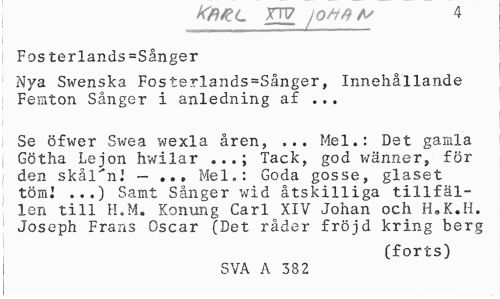 //// Fos terlands =Sånger //// Nya Swenska Fosterlands=Sånger, Innehållande Femton Sånger i anledning af ... //// Se öfwer Swea wexla åren, ... Mel.: Det gamla Götha Lejon hwilar ...; Tack, god wänner, för den skål^nJ - Mel.: Goda gosse, glaset töm] ...) Samt Sånger wid åtskilliga tillfällen till H.M. Konung Carl XIV Johan och H.K.H. Joseph Frans Oscar (Det råder fröjd kring berg //// (forts) //// SVA A 382 ////