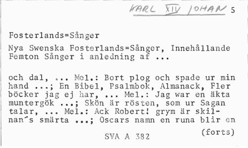 //// rmc xjy 5 //// Fosterlands=Sånger //// Nya Swenska Fosterlands=Sånger, Innehållande Femton Sånger i anledning af ... //// och dal, ,. Mel,: Bort plog och spade ur min hand En Bibel, Psalmbok, Almanack, Fler //// böcker jag ej har, ... Mel.: Jag war en äkta muntergök ...; Skön är rösten, som ur Sagan talar, ... Mel.: Ack Robert! grym är skil-nan/s smärta Oscars namn en runa blir en //// SVA A 7>82 (forts) ////