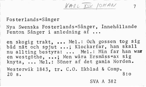 //// XtHlU joHAV 7 //// Fosterlands=Sånger //// Nya Swenska Fosterlands=Sånger, Innehållande Femton Sånger i anledning af ... //// en skogig trakt, ... Mel.: Och gossen tog sig båd nät och spjut ...; Klockarfar, han skall nu allting bestyra: ... Mel.: Min far han war en westgöthe, ...; Men wåra Ersmäss=ax sig knyta, ... Mel.: Söner af det gamla Norden. //// Westerwik 1843, tr. C.O. Ekblad & Comp. 20 s. 8:o //// SVA A 38 2 ////