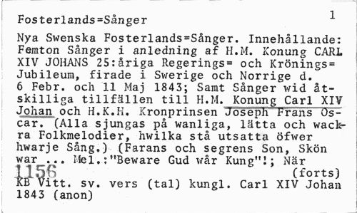 //// Fosterlands=Sånger 1 //// Nya Swenska Fosterlands=Sånger. Innehållande: Femton Sånger i anledning af H.M. Konung CARL XIV JOHANS 25:åriga Regerings= och Krönings= Jubileum, firade i Swerige och Norrige d. 6 Febr. och 11 Maj 1843; Samt Sånger wid åtskilliga tillfällen till H.M. Konung Carl XIV Johan och H.K.H. Kronprinsen Joseph Frans Oscar. (Alla sjungas på wanliga, lätta och wack-ra Folkmelodier, hwilka stå utsatta öfwer hwarje Sång.) (Farans 0ch segrens Son, Skön war ... Mel,;"Beware Gud wår Kung"!; När 1156 (forts) //// KB Vitt. sv. vers (tal) kungl. Carl XIV Johan 1843 (anon) ////