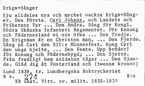 //// Krigs=Sånger //// Sju alldeles nya och mycket v/ackra Krigs=Sång-er. Den Första. Carl Johans, och Landets och Frihetens Far ... Den Andra. Sång för Kongl. Södra Skånska Infanteri Regementet. För Konung och Fädernesland wi oss öfwa ... Den Tredje. En Krigsman är en Christen man, ... Den Fjerde. Sång på Carl den XII:s Minnesfest. Kung Carl den unga hjelte, ... Den Femte. Upp Broderi för Konung och Fädernebygd; ... Den Sjette. Från fredligt hem soldaten tågar ...Den Sjunde. Gläd dig åt Fosterland och (twenne kronor) //// Lund 1839, tr. Lundbergska Boktryckeriet //// 8 s. 274 8:0 //// KB okat". Vitt. sv. milit. 1835-1938 ////