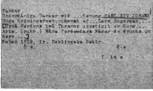 //// ¦ ' - ; ' ¦ TanKar i //// Underdånig Tankar wjd . . gonimr fASL^y .TOHA^' Höga Krönin«r»fe«t-.-riSr»nmt af »..Lars Segeraan;, ,, DtjprsÅ Nordens t*å Throrer uppstigit er Kung, , . -Aria , ( rubr.) Wara fo-rdomda^ft Fäder de å ruefco ar horn. ». »3 //// MalÄÖ im* tr.*" BerUn««ka B^ktr. 'r ' $ ? * //// k 8 s. 6 - <>r ' • * • //// £§S ' ' ' il „ . ^ 1 M ////
