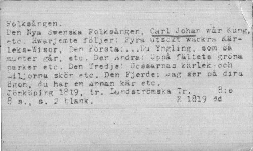 //// Folksången. \ //// Den Eya owensic» Folksången, Carl Johan vår i^ung, etc. Hwarj em te följer: Fyra utslit w^ckra Kär-leks-Wieor, De* rörsta:.,.Du Yngling, c osa sa •munter ."år, etc. Der anära: Uppå faltets j-rona parker etc. Den 'fred ja i Gossarnas knrlek-ech //// or.p» sken etc. Den F^erde: vag ser på djra c-ron, du har er a^n&n kär etc. Jönköping 1P19, tr. Lund strömska Tr. B: o //// 8 s., s. 2 V;lark. K l3l9 ** ////
